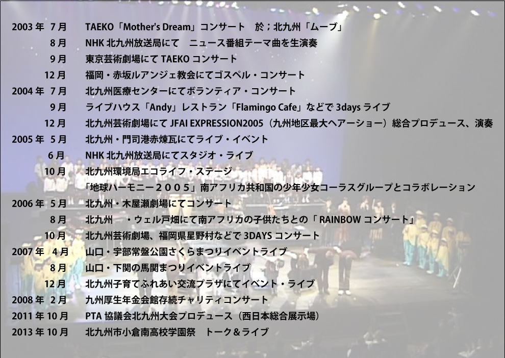 宇多田ヒカル、MISIA,SMAP,安室奈美恵,MAX,Chage&Asuka,MrChildren,スピッツ,井上陽水,Aiko,松浦亜弥,LUNA SEA,今井美樹,浜崎あゆみ,L←→Rなど、幅広い楽曲を取り上げてきました。